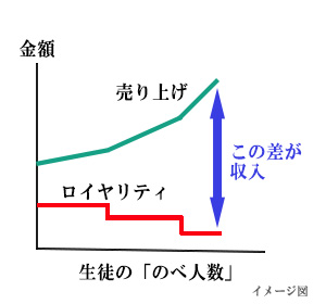 ECCジュニアの看板を借りて教室を運営していきますので、当然ECCへ支払うロイヤリティがあります。 このロイヤリティの金額は、スタート時点は50%から始まり、生徒数に応じて最大23%まで下げることができます。